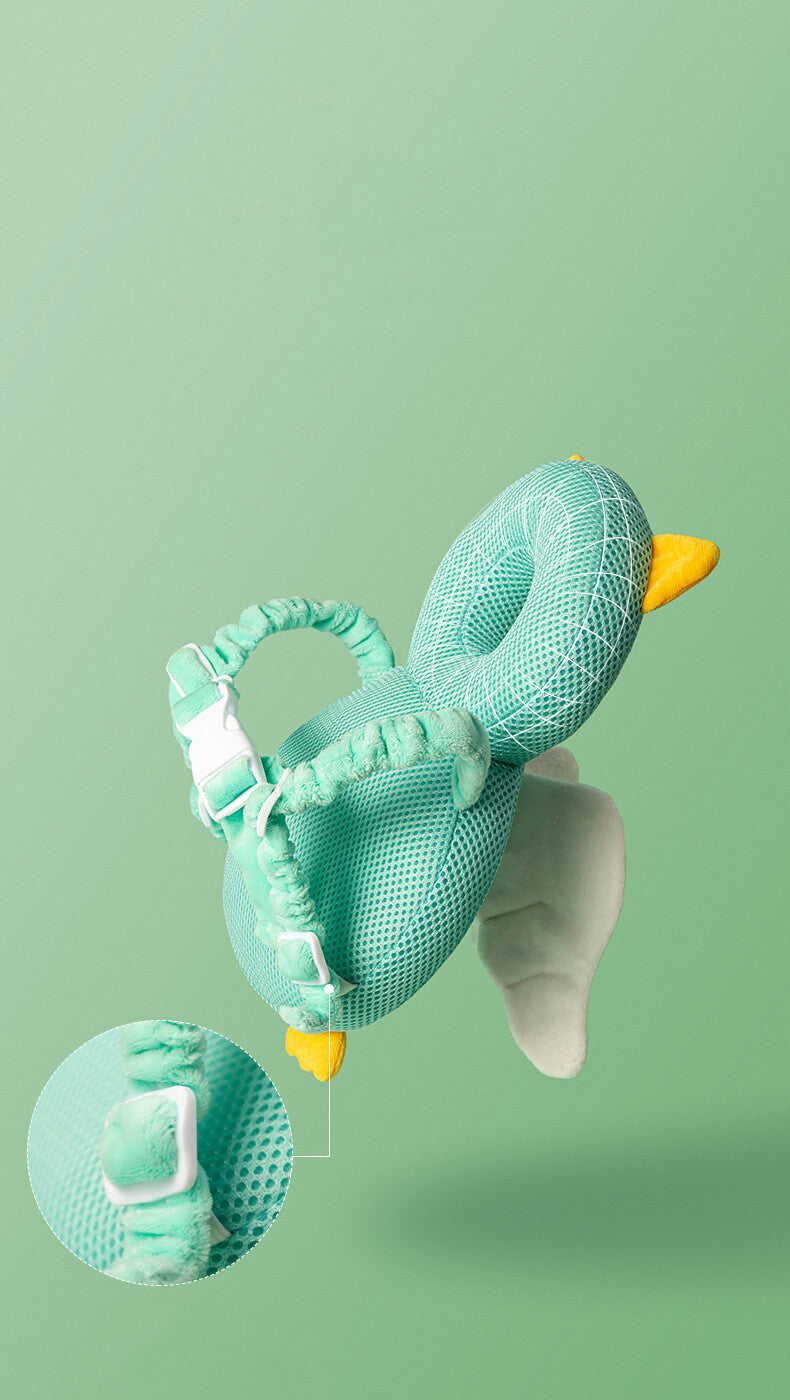 Den fungerar som ett mjukt skydd mot fall bakåt och minskar risken att barnet slår i bakhuvudet.